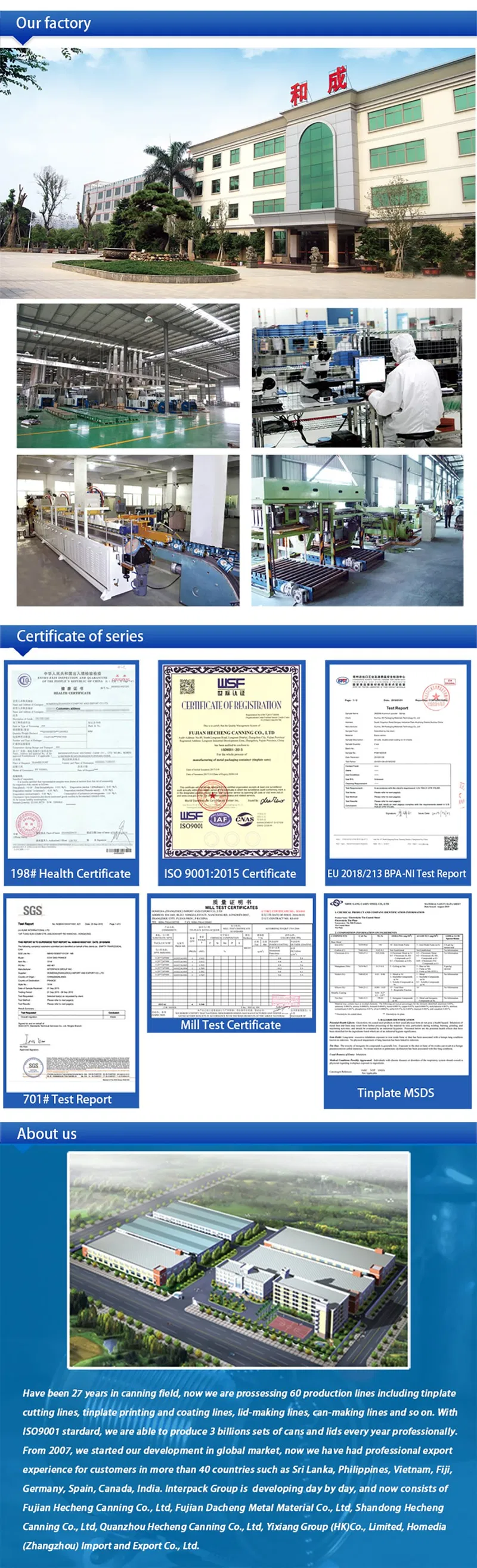 HOMEDIA (ZHANGZHOU) IMPORT UND EXPORT Co., Ltd. Entwickelt sich Tag fü R Tag und besteht jetzt aus Fujian  Hecheng  Canning  Co.,   Ltd, Fujian  Dacheng  Metal  Material  Co.,   Ltd, Shandong  Hecheng  Canning  Co.,   Ltd, Quanzhou  Hecheng  Canning  Co.,   Ltd, Shanghai  Yixiang  Co.,   Ltd., begrenzten.   Gegrü Ndet auf unserer Firmakultur - Ehrlichkeit, gewinnen Vertrauen, Wert, Team, alles, erbringen wir immer die sichere und kosteneffektive Verpacken der Lebensmitteldienstleistung fü R Entwicklung der Abnehmer.   Unser Anblick ist, ein Berufsverpacken der Lebensmittelservice-Lieferant in der Welt zu sein